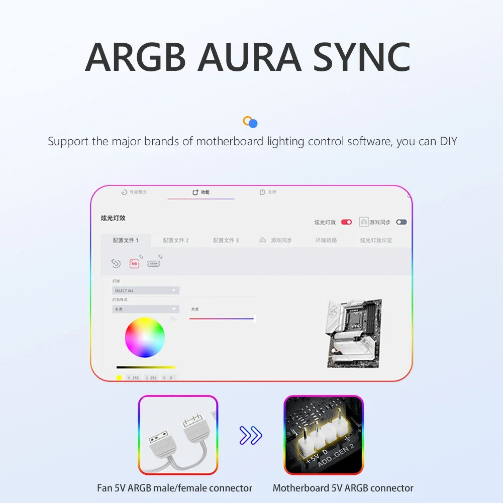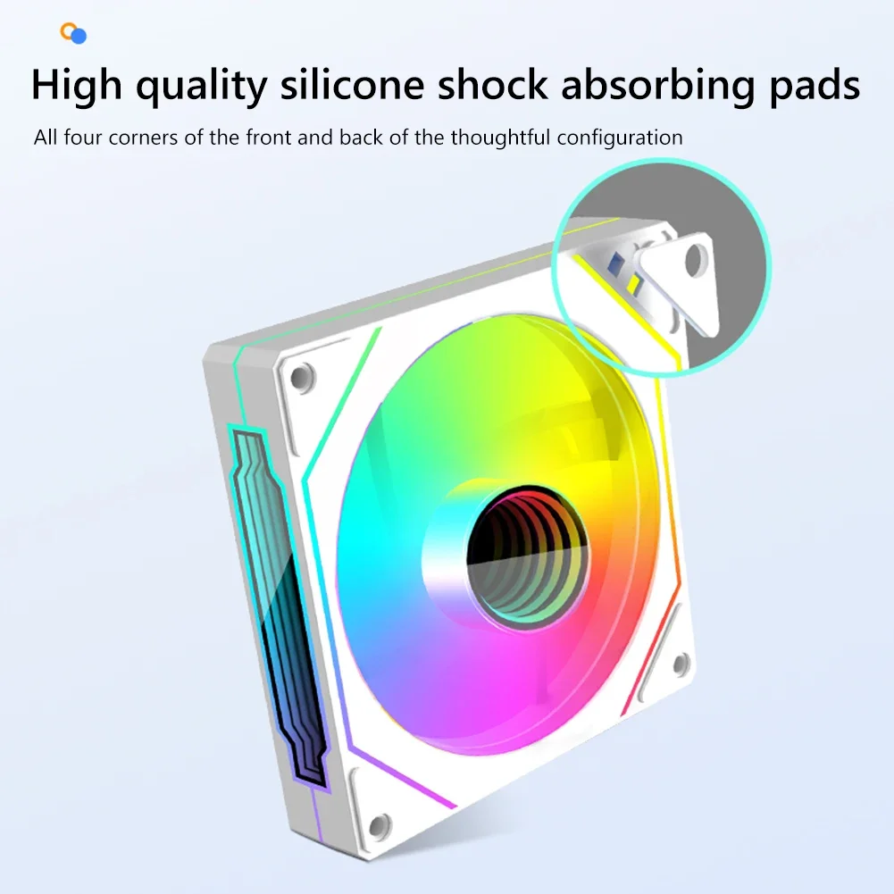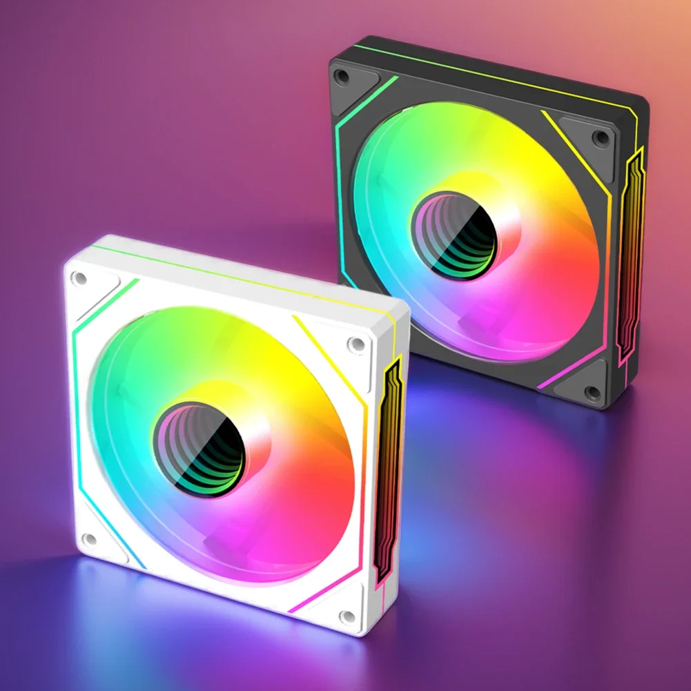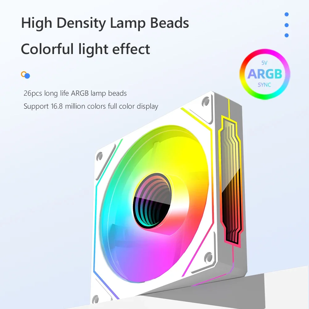 Features: 1. Powerful Airflow: The fan blades of computer chassis fan are designed with a combination of biomimetics and fluid mechanics, resulting in a smooth operation even at full speed. With 9 blades and a special texture design, it generates a strong air pressure and delivers an impressive airflow of 71CFM, providing powerful cooling performance. 2. High-Quality Materials for Comfort: The fan blades are made of high-strength and high-temperature-resistant PBT material, ensuring long-lasting durability without deformation. The quiet cooling fan frame is equipped with silicone foot pads on the corners, effectively reducing vibration and minimizing noise, giving you a quiet and comfortable experience. 3. Infinite Lens Lighting Design: With a unique dual-line design, the silent computer cooler fan features lens design on both sides and the rotating axis, creating a visually stunning effect. The side mirrors on the left and right sides of the fan create a geometric infinity effect, while the circular mirror in the center showcases multiple layers, adding a touch of elegance. 4. 5V ARGB Synchronization: Compatible with ASUS, MSI, Gigabyte, ASRock, and other motherboards with addressable 5V ARGB headers, allowing for software-controlled lighting effects. With 26 high-density and high-brightness ARGB LEDs, cpu case cooling fan supports 16.8 million colors, creating vibrant and immersive lighting displays. 5. Noise Reduction and Silent Cooling: Equipped with a 4-pin PWM interface, the silent ventilador supports intelligent temperature control via the motherboard, automatically adjusting the fan speed based on CPU temperature for energy-saving and noise reduction. The hydraulic bearing design, with a large oil storage space and a unique oil supply circuit, combined with a powerful magnetic motor, ensures longer fan life, quieter operation, and enhanced durability. The fan can be set to rotate in either the forward direction (blowing air towards the back of the fan) or the reverse direction (blowing air towards the front of the fan). This allows for better display of the lens design when installing the fan in a computer case, without obstruction from the fan bracket, resulting in a more aesthetically pleasing and cool lighting effect. (The forward direction is generally suitable for the top and rear of the case, while the reverse direction is generally suitable for the front and bottom of the case.) Specification: Fan Size: 120mm Origin: Mainland China Air Volume: 71 Bearing: Fluid Bearing Blade Quantity: 9 Certification: CE Lines: 2 lines Noise: 20dBA Package: Yes Used For: case Voltage: 5V Color: black, white (optional) Wind direction: Forward rotation (wind blows toward the back of the fan), reverse rotation (wind blows toward the front of the fan) (optional) Bearing: hydraulic bearing Number of fan blades: 9 Speed: 800~1800 RPM Wind pressure: 2.35mm H2O Air volume: 71CFM Noise: 10~25dBA Power: 4.2W Rated voltage: DC 12V fan; DC 5V lamp bead Rated current: 0.36A ARGB rated current: 0.18A Life expectancy: 1000000H (hours) Fan interface (male and female interface): 4-Pin PWM ARGB interface (male and female interface): 5V 3-Pin Wire length: 500mm Applicable: CPU radiator/Radiator water cooling radiator/host chassis for 120mm fan Size: 120.00×120.00×25.00mm/4.72×4.72×0.98inch Weight: 0.15KG Note: If the motherboard supports the 5V 3-pin ARGB interface, you do not need to use an ARGB controller. You can connect it directly to the motherboard. If it does not support it, a separate fan cannot be used and must be used with an ARGB controller. Forward wind direction is generally suitable for the top and back of the chassis, and reverse wind direction is generally suitable for the front and bottom of the chassis. Due to the different monitor and light effect, the actual color of the item might be slightly different from the color showed on the pictures. Thank you! Please allow 1-2cm measuring deviation due to manual measurement. 1 x Fan?
