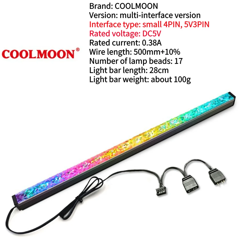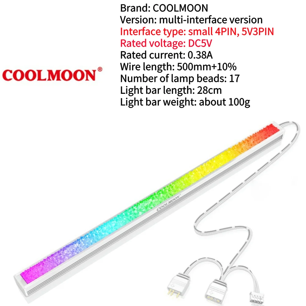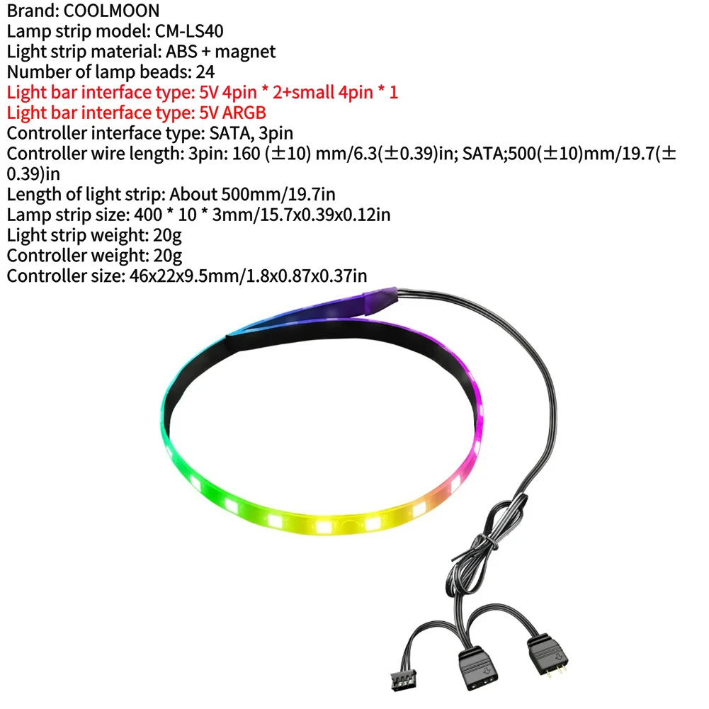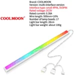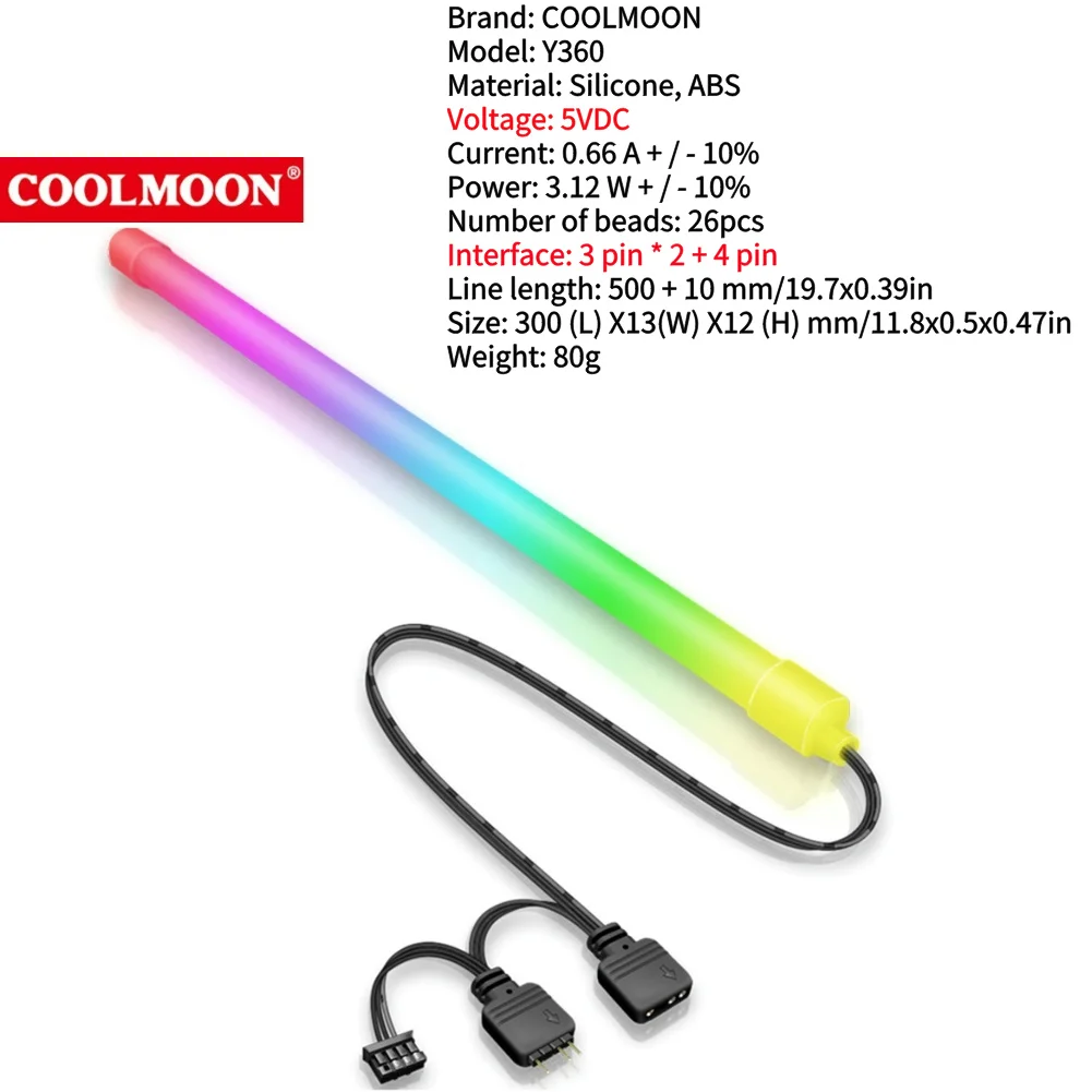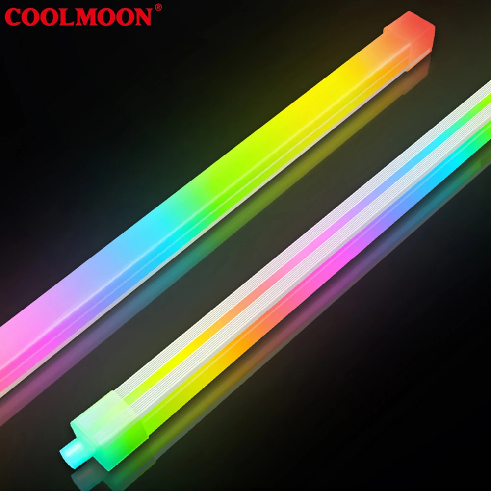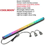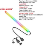 Feature: 1. Bright soft light beads, full color without dazzling: The 300mm tube length of F300 silicone lamp strip is equipped with up to 26 lamp beads, which account for a large proportion of density, so the light is very bright and soft. One light bar can be switched, two completely different styles. F300 silica gel lamp strip is square tube type, with 3 sides of full luminescence + 1 side of thin light strip. Compared with traditional lamp strips, buy a light equivalent to “2”. 2. High quality silica gel: White as jade, flexible and durable. Silica gel has the advantages of strong light guide, soft and durable; milky silica gel is neat and beautiful, and the color is very full and bright when the light is on. 5V ARGB AURA SYNC, programmable 16 million colors. It supports the second generation addressable (5V) ARGB for ASUS/MSI/Gigabyte/ASRock and other mainboards. It can control light synchronization through software and customize 16 million colors (if the mainboard supports ARGB second generation interface). 3. Different luminous surfaces give you different surprises: Thin light strips show a sense of hierarchy and technology. Trying different styles can often build surprising light effect scenes. The excellent light guide of silica gel makes all kinds of colors appear well; the monochrome light is also very bright and full. A variety of static monochrome modes allow you to switch and choose your favorite color style. 4. The cool installation effect allows you to experience the extraordinary light and shadow world: Cool light pollution is created with Coolmoon brand products, and the lights of the whole machine change color synchronously. Super multi modes are waiting for you to light up. The size is carefully designed and has very good compatibility. It can be installed in most chassis on the market. The light bar is fixed with transparent buckle, which is not only beautiful and durable, but also does not affect the light transmission; it is equipped with double-sided adhesive, which is simple, stable and reliable. 5. Multi interface design makes it easier to expand and install: 5V 3-pin ARGB dual interface + small 4Pin interface design greatly improves the scalability of the product: 5V 3-pin female head: Plug in 5V ARGB AURA SYNC interface of main board 5V 3-pin male: Multiple light strips are connected in series or with other 5V ARGB products Insulation protection cap: Cover the cap when the pin interface is not used to prevent short circuit Small 4Pin interface: Special interface for Cool moon brand controller (when the motherboard does not support 5V ARGB, it can be used with Cool moon controller). Specification: Installation steps: