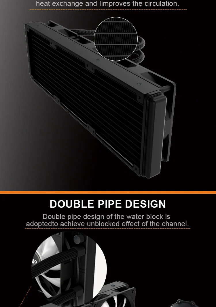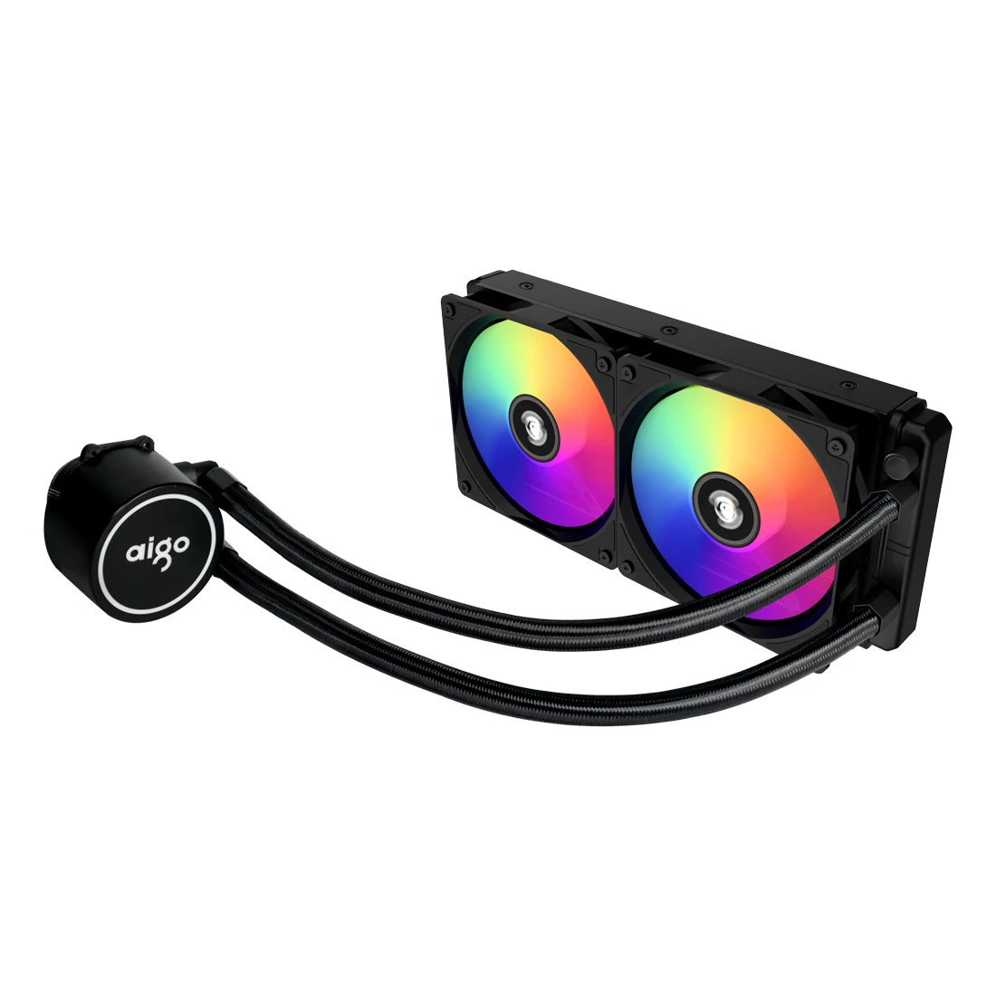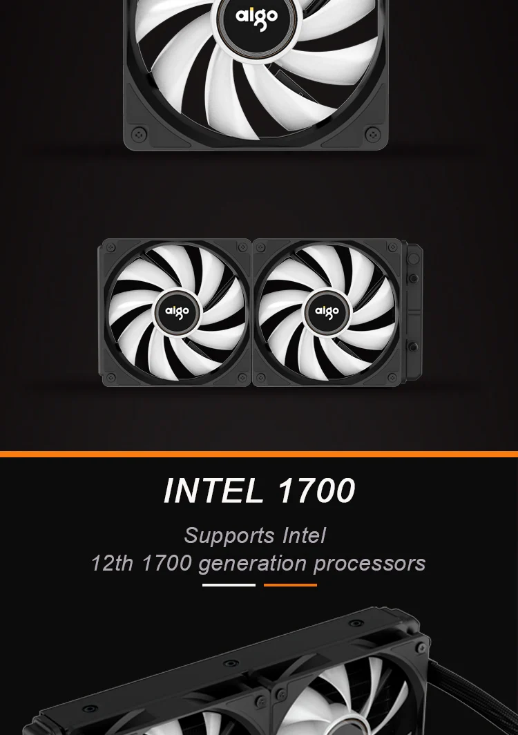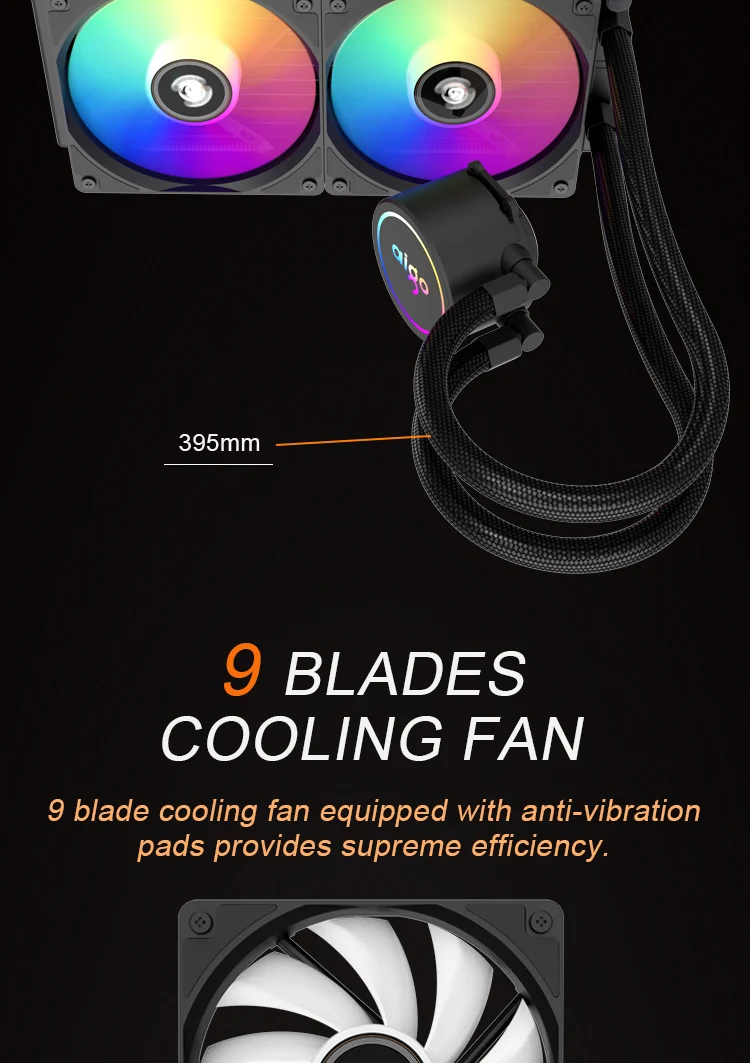AIGO AC integrated water cooling,maintenance-free, no need to add water and cold liquid for life. 12 cm temperature controlled intelligent aurora RGB color changing fan, with N.I.T. noise interception technology, all-round mute design. Ceramic bearings. Constant light. Flashing. All pure copper hot water absorption cold head, fit the CPU to fully absorb heat. 27mm aluminum radiator,High-density wave band cold row,using S-shaped fins, increase the heat dissipation area. Provides all platform mounting clips for INTER and AMD CPUs and is easy to install. Woven mesh high quality rubber water cooled tube, zero penetration, durable and durable. Efficient heat dissipation, brilliant light efficiency, highly translucent 3D collapse cold head design.