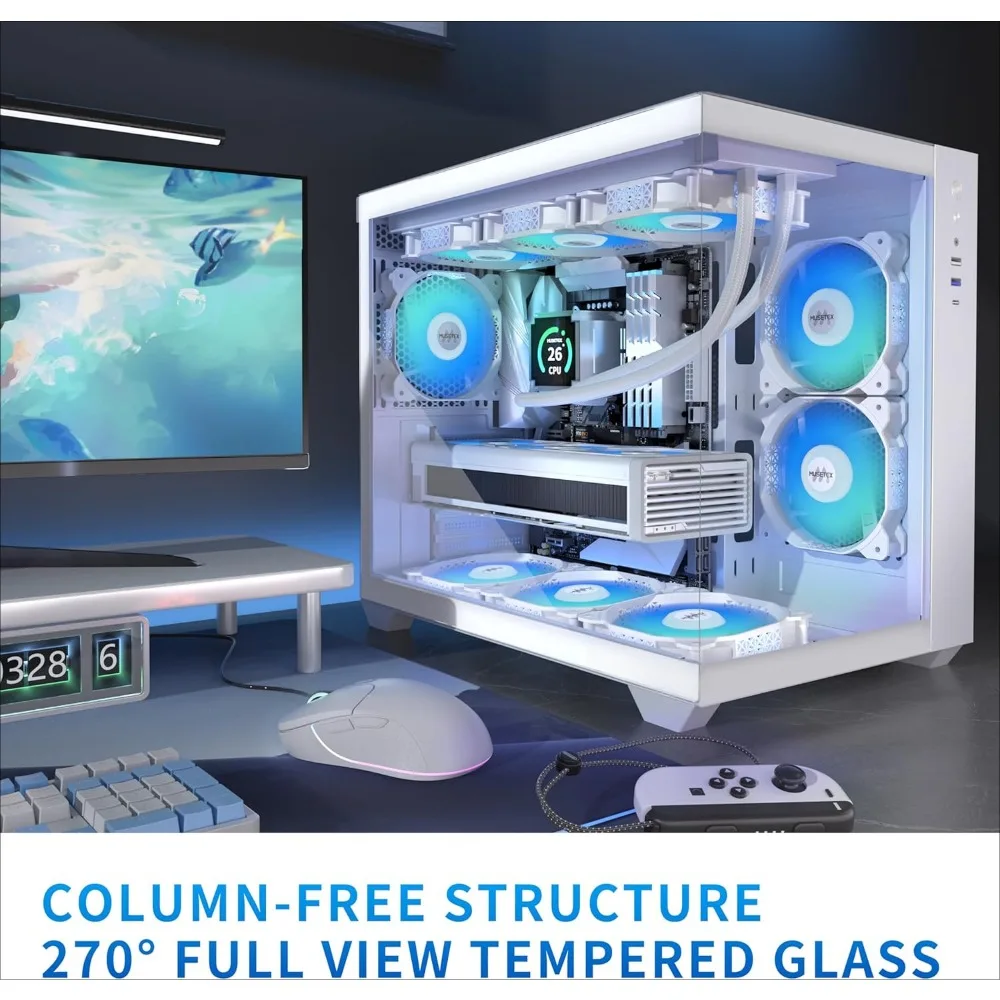 • We offers a great gaming pc case Y6 for visual experience and setup experience,with 6 pre-installed PWM ARGB fans, the two fans on the side adopt reverse blade design for good heat dissipation and more beauty. White pc case breaks black conventional impression, with 270? fully transparent dual tempered glass panels for a wider field of view than most of the same atx case on the market,which can display user’s high end PC hardware and beloved dolls,and will harvest cool admiration from friends!