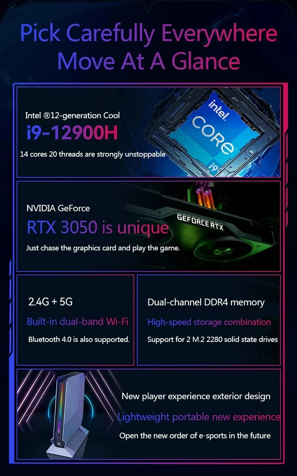 Gaming Mini PC with Inter i9-12900HK Nvidia RTX4060 Support WIN10 LINUX 2xDDR4 6xUSB 1xHDMI Type-C WiFi BT4.0 Desktop Computer