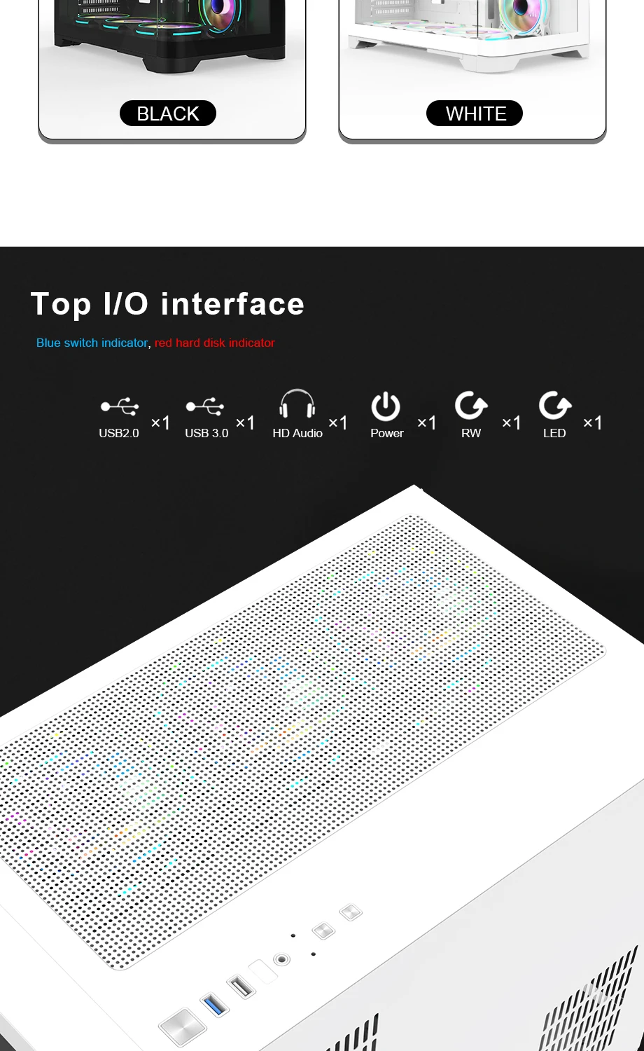 front ports: USB3.0*1+USB1.0*1+HDAudio