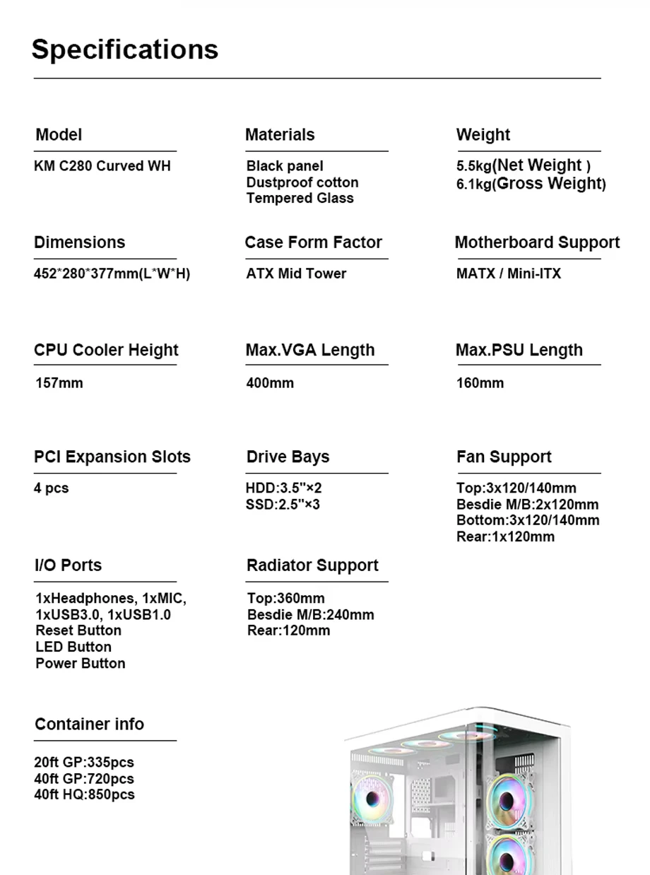 Motherboard: Motherboard :Micro ATX/Mini-ATX PSU:ATX PSU Maximum 200mm